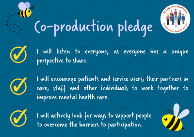 The co-production pledge makes sure patients have an equal say in their care. Everyone at St Andrew's Healthcare is being asked to take the pledge which has been created as part of our Co-production Framework.