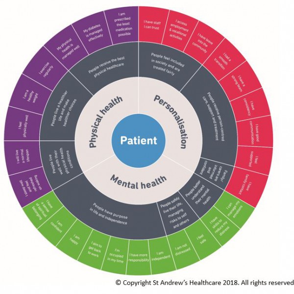 To record these measurements we have developed an Outcomes Framework (pictured right) which is in the shape of a wheel. It was produced together by our clinicians, patients and carers, and covers three main areas: mental health, physical health and personalisation of care. Our clinicians and multi-disciplinary teams use the framework to monitor patients’ progress, their quality of life and importantly, their experience of the care they receive at St Andrew’s.